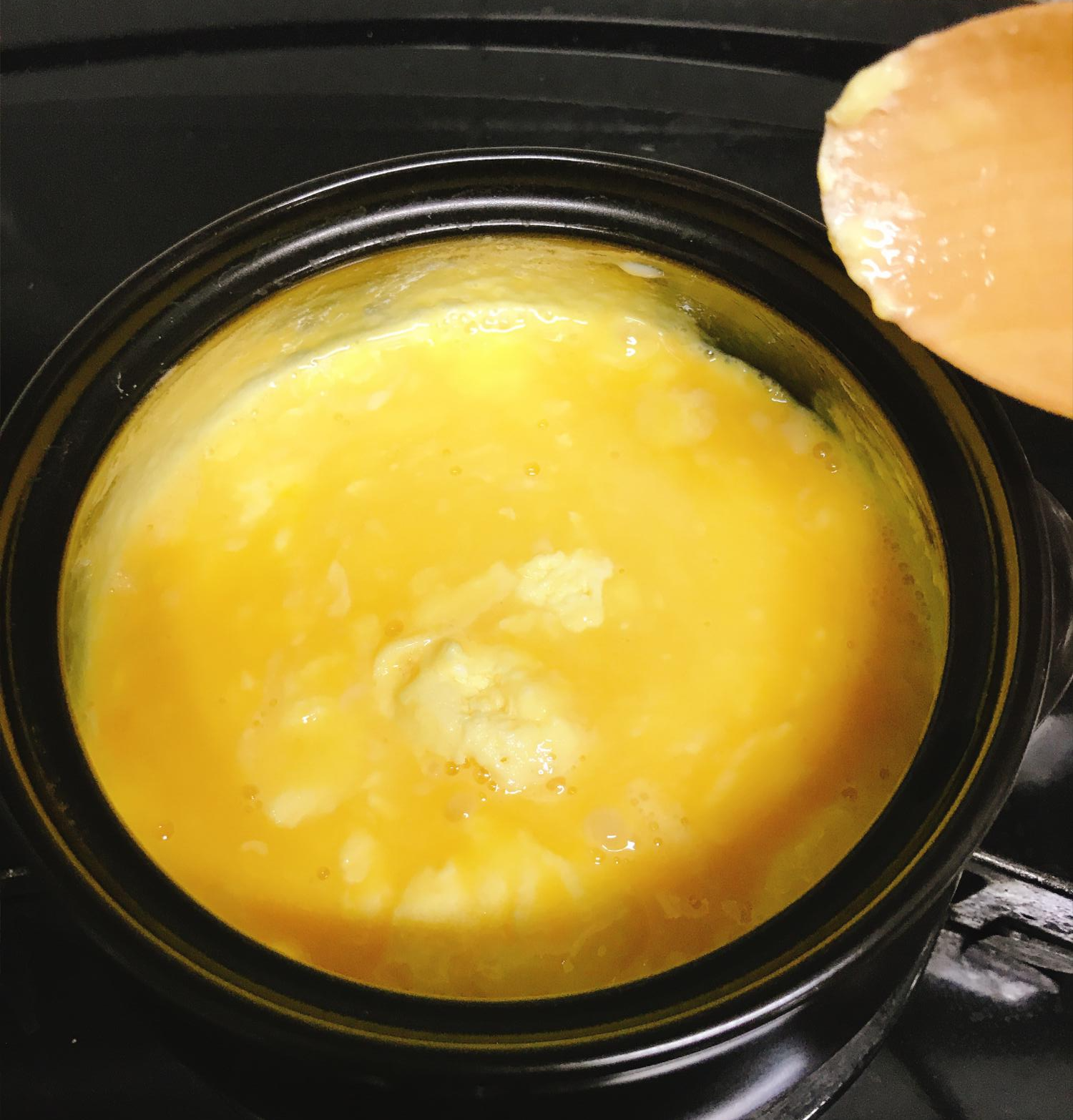레시피에서는 여기서 뚜껑을 덮고, 약불로 줄인후에 계란물이 뚝배기 사이로 흐르다가 멈출때!!